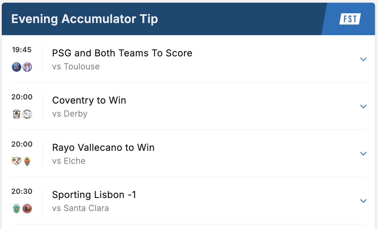 PSG to win and both teams to score was our Bet of the Day, tipped at 19/10. We also paired that with Coventry in a BTTS & Win double, which landed at 8/1.