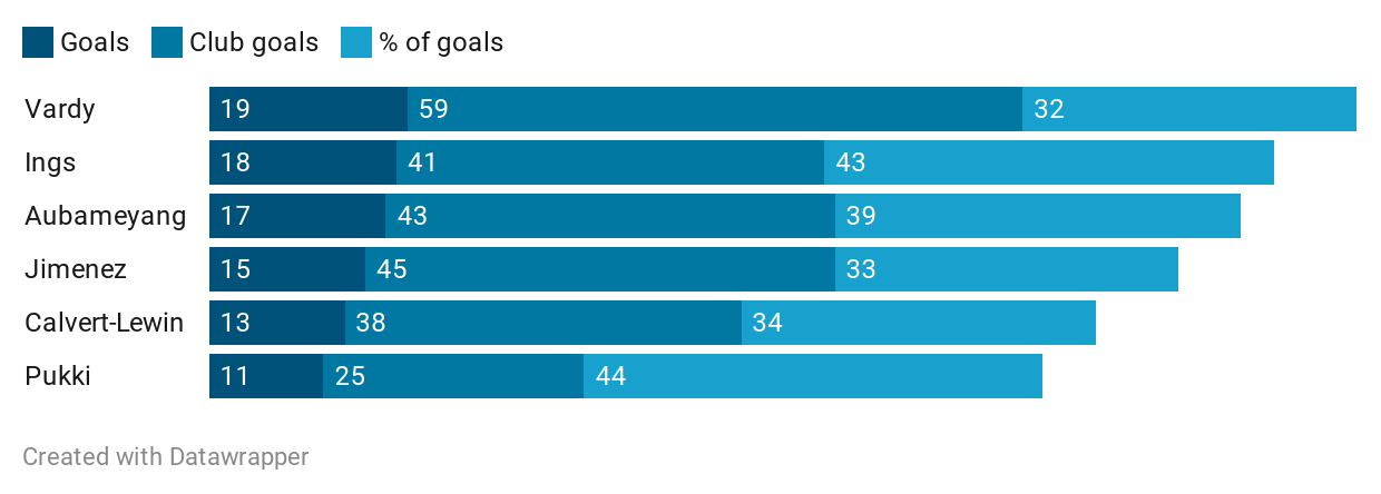 Without Vardy pitching in his share, Leicester managed to score just 17 times in 15 fixtures since January 8, in fact, Vardy’s 19-goal harvest accounts for a full 32% of Leicester’s total goals in England’s top flight this season – a figure that points to an overreliance that few other Premier League clubs can match.