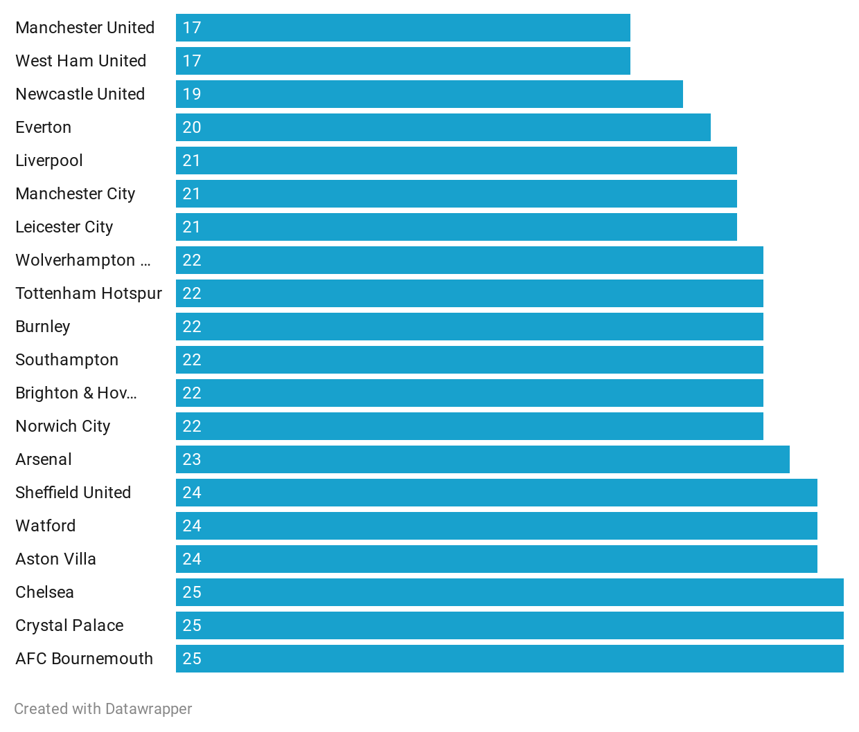 In the above graphic, we’ve listed the 20 Premier League clubs run in difficulty scores from easiest to toughest – an ordering that throws up some fascinating results.