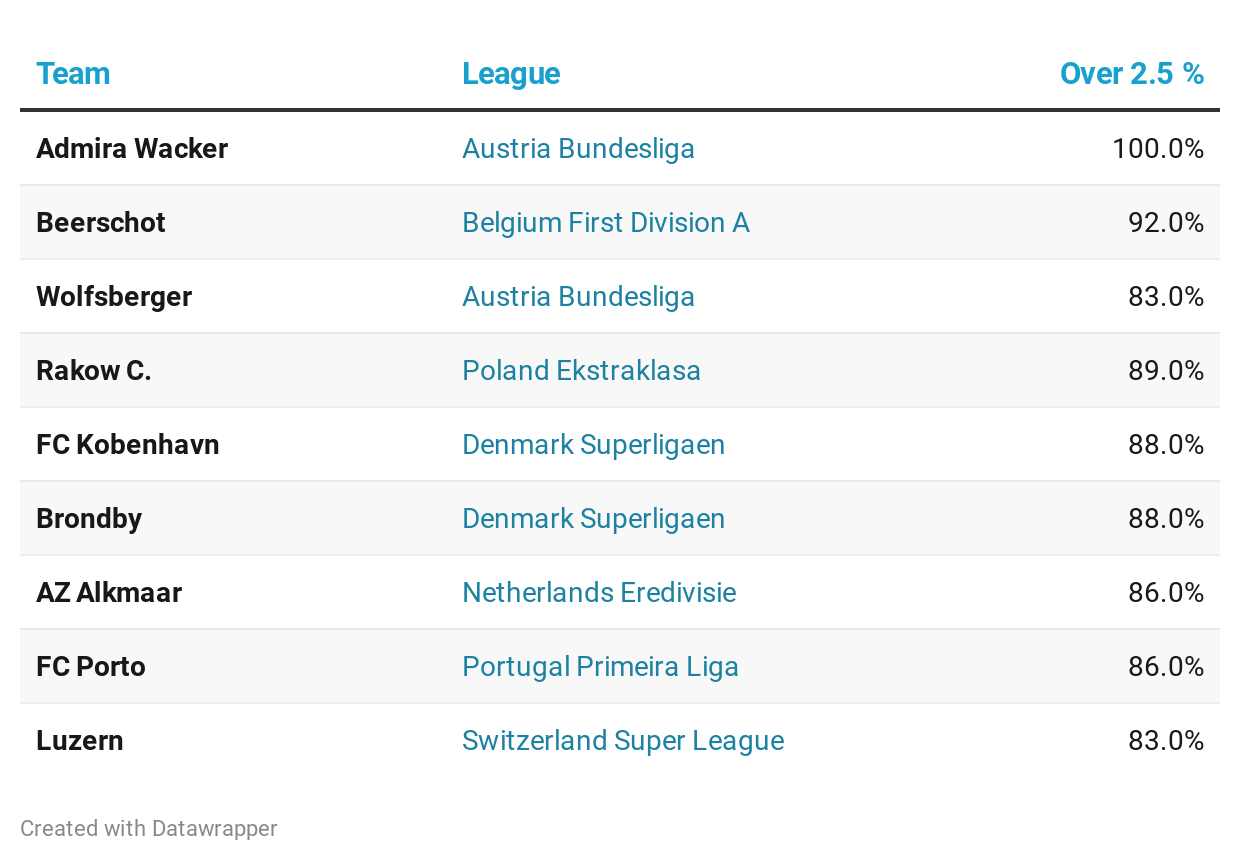 A talented young AZ Alkmaar outfit are the Eredivisie’s most entertaining side this season in the Netherlands, and over 2.5 goals were scored in 100% of their away matches and 86% of their league fixtures overall, while Portuguese behemoths Porto (86%) and Swiss club Luzern (83%) should also be on your watch-list.