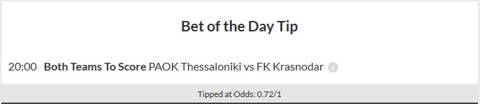 We also included our BTTS tip in PAOK’s clash with Krasnodar as Wednesday night’s Bet of the Day, continuing a great run of predictions. That was our fifth winning Bet of the Day in the final six days of last month.